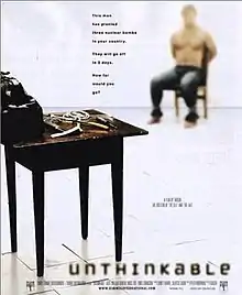 Unthinkable is a 2010 American thriller film directed by Gregor Jordan and starring Samuel L. Jackson, Michael Sheen and Carrie-Anne Moss. It was released direct-to-video on June 14, 2010.[2] The film is noteworthy for the controversy it generated around its subject matter, the torture of a man who threatens to detonate three nuclear bombs in three U.S. cities.[3]