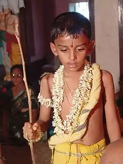 The sacred thread or upper garment is also called Yajñopavita, used as an adjective, which is derived from Yajna (sacrifice) and Upavita (worn).[20][21] The literal meaning would then become "some thing worn on the body for the sacrifice".[22] Along with the Yajñopavita there may be a danda (staff) and mekhala (girdle).[23]