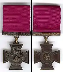 The Victoria Cross awarded in 1900 and presented in 1901 by Prince George, Duke of York (later George V), to UCC Old Boy Hampden Zane Churchill Cockburn and in UCC's possession, though on permanent loan to the Canadian War Museum