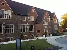 The land was purchased in 1913,[41] at a time when the city of Toronto was quickly growing around the college's Deer Park campus and the trustees were considering moving the school to a new location. Plans for buildings were drawn up by an architectural firm. However, due to the outbreak of the First World War and then the depression, the move was fully abandoned in the 1930s.[17] The college first attempted to sell the land in 1928 and again in 1935, but found no buyers.[71] Eventually, the property was developed into an outdoor education centre for UCC students and community. Beginning in 1913, an annual picnic was held at Norval, the first being catered by the King Edward Hotel. As the land had originally been cleared for agricultural use, much of the site was open field until over 700,000 seedlings were planted by staff and students through the 1940s,[72] followed by the creation of an arboretum in 1962.[71] The first bunk house was built in the 1930s and augmented in 1967 by another, larger residence and dining building known as Stephen House,[17] which won a Massey Medal for excellence in architecture for the designer, Blake Millar.[42] Stephen House contains a classroom and laboratory, in addition to the residential spaces for students and staff. There is also a bungalow-style residence for the property caretaker and in 2003 several log cabins were built for writing retreats.