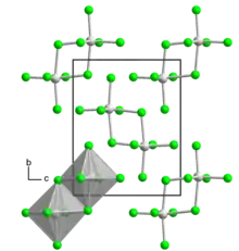 There are two crystalline forms, each of which has the uranium atom in an octahedral geometry among six chlorine atoms. Usually, it is in the α-form, which has a monoclinic crystal structure with space group P21/n. There is also a triclinic β-form, which has space group P1[2] and consists of U2Cl10 dimers like in uranium pentabromide.[3]