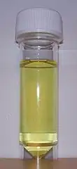 Urine after four months of storage (note the color and turbidity change compared to fresh human urine). During storage, the urea in urine is rapidly hydrolyzed by urease, creating ammonia. Collected urine can be used as a fertilizer.