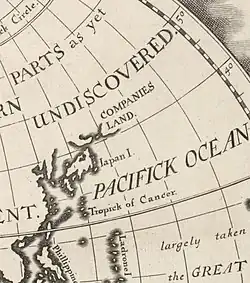 The Castricum under Maarten Gerritsz Vries was the first recorded European vessel to reach this part of the Kurils, arriving in 1643[3] while exploring Hokkaido and the surrounding area for the Dutch East India Company (VOC).[4] Vries's garbled account of the islands during an era when longitude was difficult to calculate was the origin of the large phantom island Company Land (Dutch: Companies Landt; French: Terre de la Compagnie) that subsequently appeared on European maps at various positions northeast of Honshu.[4] Named in reference to the VOC, it was considered by Vries to be the northwesternmost projection of North America[5] and its appearance on the maps of the respected cartographers Jan Janssonius,[6] Nicolas Sanson,[7] and Guillaume Delisle spread it through other European maps for another century before more accurate surveys became generally accepted.[8] The original location of Vries's landing is sometimes specifically located on Urup.[3][9]