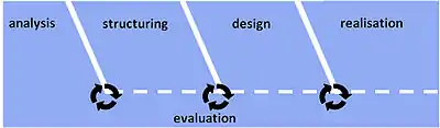 The Useware development process distinguishes the following steps: analysis, structure design, design, realisation, and evaluation. Each of these steps should not be regarded separately but rather overlapping. The continuity of the process as well as the use of suitable tools, e.g. on the basis of the Extensible Markup Language (XML) make it possible to avoid information losses and media breaks.