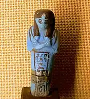 Ushabtis were placed in tombs among the grave goods and were intended to act as servants or minions for the deceased, should they be called upon to do manual labor in the afterlife. The figurines frequently carried a hoe on their shoulder and a basket on their backs, implying they were intended to farm for the deceased. They were usually written on by the use of hieroglyphs typically found on the legs.[1][2] They carried inscriptions asserting their readiness to answer the gods' summons to work.[3]