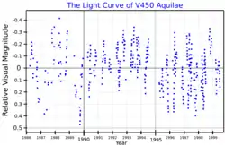 V450 Aquilae is semi-regular pulsating star in the constellation Aquila. Located around 660 light-years distant, it shines with a luminosity approximately 2172 times that of the Sun and has a surface temperature of 3326 K.[3]