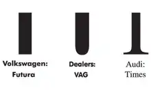 The typeface was used for the Volkswagen and Audi Dealer Organization, and for all non-car related activities of Volkswagen, such as the V.A.G Bank and V.A.G Leasing. The typeface was conceived in a general overhaul of Volkswagen's corporate identity.