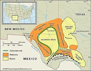 {{cite journal}}: Cite journal requires|journal=(help) - "Permian Basin | area, Texas, United States". Encyclopedia Britannica. Retrieved 2017-11-30.