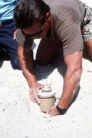 ![]() A Valmara 69 mine during training by Explosive Ordnance Disposal (EOD) Team in Kuwait, 1992. | |