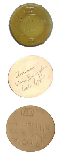 The Van Briggle logo consists of a pair of conjoined A's inside a box, and is featured on most — but not all — Van Briggle pottery. Other marks that might appear on the bottom of their pottery include the text, "Van Briggle", "Colorado Springs, Colorado" most frequently abbreviated, artist marks indicating the artist who threw the piece or finished it, or both, clay batch numbers, and year of manufacture indicators. The variety of marks is broad and beyond the scope of an encyclopedia article to list.