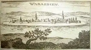 In Hungarian the town is known as Varasd, in Latin as Varasdinum and in German as Warasdin. The name Varaždin traces its origin in the word varoš, a Hungarian loanword meaning city.[4]