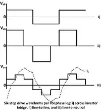 - Six-step inverter drive topologies (see image):[lower-alpha 5][45] Now largely obsolete, six-step drives can be either VSI or CSI type and are also referred to as variable-voltage inverter drives, pulse-amplitude modulation (PAM) drives,[46] square-wave drives or D.C. chopper inverter drives.[47] In a six-step drive, the DC output of the SCR-bridge converter is smoothed via capacitor bus and series-reactor connection to supply via Darlington Pair or IGBT inverter quasi-sinusoidal, six-step voltage or current input to an induction motor.[48]