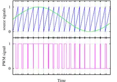 Although space vector pulse-width modulation (SVPWM) is becoming increasingly popular,[17] sinusoidal PWM (SPWM) is the most straightforward method used to vary drives' motor voltage (or current) and frequency. With SPWM control (see Fig. 1), quasi-sinusoidal, variable-pulse-width output is constructed from intersections of a saw-toothed carrier signal with a modulating sinusoidal signal which is variable in operating frequency as well as in voltage (or current).[11][18][19]