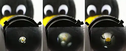 A varifocal lens is a camera lens with variable focal length in which focus changes as focal length (and magnification) changes, as compared to a parfocal ("true") zoom lens, which remains in focus as the lens zooms (focal length and magnification change). Many so-called "zoom" lenses, particularly in the case of fixed-lens cameras, are actually varifocal lenses,[1] which give lens designers more flexibility in optical design trade-offs (focal length range, maximum aperture, size, weight, cost) than parfocal zoom. These are practical because of autofocus, and because the camera processor can automatically adjust the lens to keep it in focus while changing focal length ("zooming") making it suitable for still photography where a change in magnification of the subject, as demonstrated below is not a problem. The change in the subject size is a significant problem in video and true parfocal designs are needed for higher quality video work. Varifocal lenses can be used for image display as well as capture, and Oculus VR has confirmed developing a varifocal display for virtual reality.[2]