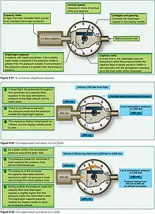 Variometers measure the rate of change of altitude by detecting the change in air pressure (static pressure) as altitude changes. Common types of variometers include those based on a diaphragm, a vane (horn), a taut band, or are electric based. The vane variometer consists of a rotating vane, centered by a coil spring, dividing a chamber into two parts, one connected to a static port, and the other to an expansion chamber. Electric variometers use thermistors sensitive to airflow, or circuit boards consisting of variable resistors connected to the membrane of a tiny vacuum cavity.[5][6][7][8]