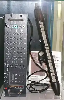 A Variophon is an electronic wind instrument invented in 1975 by researchers at the University of Cologne. It synthesizes sounds using the principle of most common brass instruments, creating sounds based on the vibration of the player's lips and breath and the resonance in a particular body.[1] For this purpose, the instrument is played using a pipe-controller, while the pitch is controlled either by keys on the pipe itself or in later models, an external keyboard.[2] The Variophon can alternate in timbres, imitating a variety of wind instruments, ranging from the harmonica to clarinet, saxophone or tuba. The variophon has a processing unit, dubbed "the music cockpit" which the controller must be connected to. The controlling voltages of the blow controller and keys combine to influence the shape, width, and height of the electric pulses. The pulses it creates are modeled by the pulse formations of real wind instrument sounds, which is how the variophon replicates the sounds of these instruments.