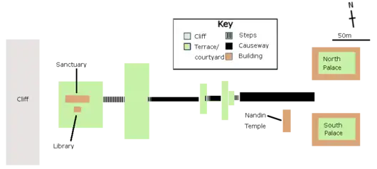 The two palaces stand on a terrace on either side of the axis. They are known as the north and south palaces or, without any evidence, the men's and women's palaces (the term "palace" is a mere convention and their purpose is unknown). Each consisted of a rectangular courtyard with a corridor and entrance on the side towards the axis, and false doors at the east and west ends. The courtyards of both buildings have laterite walls. The walls of the northern palace's corridor are laterite, while those of the southern palace are sandstone. The northern building is now in better condition. The palaces are notable chiefly for their pediments and lintels, which are in the early Angkor Wat style.