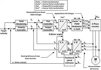 Vector control accordingly generates a three-phase PWM motor voltage output derived from a complex voltage vector to control a complex current vector derived from motor's three-phase stator current input through projections or rotations back and forth between the three-phase speed and time dependent system and these vectors' rotating reference-frame two-coordinate time invariant system.[22]
