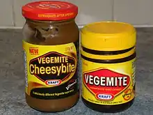 On 13 June 2009, Kraft released a new version of Vegemite. The formula combines Vegemite and Kraft cream cheese, spreads more easily and has a considerably less salty and milder taste than the original. To coincide with the release of the new recipe, Kraft ran a competition to give the new flavour a name.[47] The new name was announced during the broadcast of the 2009 AFL Grand Final as iSnack 2.0. The name was chosen by a panel of marketing and communication experts to appeal to a younger market, capitalising on the popularity of Apple's iPod and iPhone.[48][49] The choice immediately drew universal criticism and ridicule within Australia. Within days, opinion columns and social networking sites were flooded with derision and vitriol;[50] and, after only four days, Kraft released plans to abandon the iSnack name, admitting that it may have been a mistake.[51] Two days later, Kraft opened a new poll on its website, and the final name was announced on 7 October 2009 as "Vegemite Cheesybite", with Kraft claiming that the name had received 36% of the 30,357 votes that were cast for a name option, or approximately 10,900 votes.[52] It was noted that the popular suggestion "Cheesymite", long associated with the popular Cheesymite scroll, was already trademarked by other organisations.[53]
