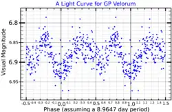 The orbital period of the system is 8.964 days, with the neutron star being eclipsed for about two days of each orbit by HD 77581. It has been given the variable star designation GP Velorum, and it varies from visual magnitude 6.76 to 6.99.[5] The spin period of the neutron star is about 283 seconds, and gives rise to strong X-ray pulsations. The mass of the pulsar is estimated to be at least 1.88±0.13 solar masses.[6]