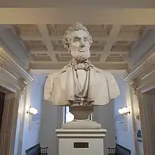 The dome and roofs were originally painted a dark terracotta red to suggest Tuscan tile. The dome was not gilded until the early 20th century, when many states did so as a part of the Colonial Revival style. The dome is topped by a statue named Agriculture, a representation of Ceres, an ancient Roman goddess of agriculture. The original statue was carved by Vermont artist Larkin Goldsmith Mead, who also carved the large bust of Lincoln in the Hall of Inscriptions on the State House's ground floor. This statue was installed in 1858. When the first statue rotted out a replacement based on Mead's original was carved in 1938 by then 87-year-old Dwight Dwinell, Sergeant-at-Arms (in Vermont this official position is similar in nature to the White House Chief Usher). In April 2018 the second statue was removed. The current statue was carved by Chris Miller out of a laminated block of mahogany and was based on a one-quarter scale model created by Jerry Williams which was also based on the original 1858 statue.[6]