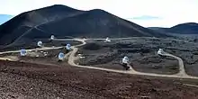 The eight radio telescopes of the Smithsonian Submillimeter Array, located at the Mauna Kea Observatory in Hawai'i.