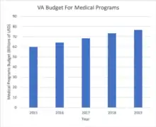 The funding the VA receives is split into mandatory, which is an amount of spending dictated by law, and discretionary spending, which is spending that can be adjusted year to year. VHA's budget is part of the discretionary spending and is by far the largest portion of the department, reaching nearly 90% of the Department's annual amount allocated annually by Congress in FY2022.[18] For FY2022, the Department's budget requested a total of $269.9 billion USD, of which $97.5 billion USD was allocated for various VHA programs, including $58.8 billion to support direct care in VA facilities, and $23.4 billion in support of community care claims. This was an increase of 10% over the FY 2021 appropriations, which were under $250 billion USD.[18]