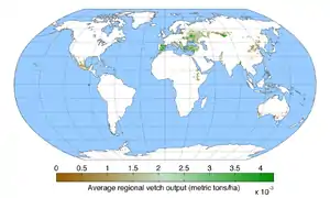 In 2017, global production of vetches was 920,537 tonnes.[6] That year, 560,077 acreas were devoted to the cultivation of vetches in the world. Over 54% of that output came from Europe alone. Africa (17.8% of world total), Asia (15.6% of world total), Americas (10.6% of world total) and Oceania (1.8% of world total).[14]