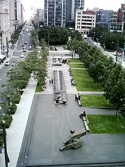 The square is now fronted on the east by the CDP Capital Centre, the World Trade Centre Montreal and the Hotel W Montréal, to the west by Tour de la Bourse and Place de la Cité internationale, to the north by the Altoria/Aimia Tower, and to the south by the Quebecor building, its outdated façade fully redesigned.