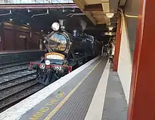 - K 190: Owned by VicTrack and operated by Steamrail Victoria, and as of September 2017 it is operating on the Victorian Goldfields Railway in Maldon. It is regularly used on suburban shuttles and on day tours to Geelong and similar-length trips. When first restored in 1977 at Bayswater and Newport, the engine was painted in a two-tone green livery using Dulux Verdant Green for the main body, British Paints Emerald Green for the wheels and borders, Sign Writer gold (lemon tint) for the lining; Dulux black enamel for the frames, tender bogies and smoke deflectors, Dulux bright red for the front and rear buffer beams, Dulux Cumberland Stone for the cab interior and Bituminious Black for the smokebox.[20] This lasted until 1992, after which the engine was returned to a plain black livery. In 1995, she was leased to the South Gippsland railway, and that organisation gave a simpler version of the green livery, using apple green on the boiler, cab, tender and cylinders (with limited dark green lining), red buffer beams both ends, and matt black frames and wheels.[21] By 4 November 2000 the engine had returned to Steamrail in Melbourne, and been repainted gloss black; by Easter of 2001 the front buffer beam had been repainted red.[22] The engine spent some time around 2010 on the Maldon railway. On Saturday 12 March 2016, the engine was restored to service in a new crimson with yellow, black and red livery, along the same lines as the R 766's previous livery. Both were inspired by the London, Midland and Scottish Railway's crimson lake livery.