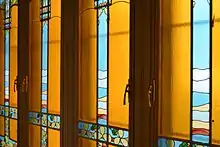 The wrought iron elements are probably the result of a collaboration between Campanini and Alessandro Mazzucotelli. This hypothesis is corroborated by some preliminary sketches for the architect's own home, found in Mazzucotelli's archive, by the high quality of the Villa's decorative elements, and by their affinities with contemporary works by the artist.[7] Villa Bernasconi has many wrought iron fixtures (the fence, the banisters, the balcony railings, some window frames) in a plethora of different motifs: wide, fleshy leaves, Secession-style graphic elements for the backstairs banisters, roses and tendrils for the main staircase.