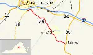 State Route 53 (SR 53) is a primary state highway in the U.S. state of Virginia. Known as Thomas Jefferson Parkway, the state highway runs 18.32 miles (29.48 km) from SR 20 near Charlottesville east to U.S. Route 15 (US 15) in Palmyra. SR 53 connects the county seats of Albemarle and Fluvanna counties. The state highway also provides access to the community of Lake Monticello and Monticello, the estate of Thomas Jefferson. The route of SR 53 became a state highway in 1930; the highway receives its present designation in 1947.