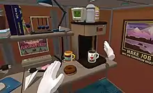 Nearly all VR games are played from a first-person perspective as to take advantage of the level of immersion created by the headset. Player input, which includes the motion of their head, hands, and body and any controller buttons or triggers they depress, are translated into actions within the game. Most commonly, the player's view of the game's environment will track with how they move their hand, and they will be shown virtual hands to guide them how to interact with the environment, with VR translating the player's motions one-to-one with the virtual appendages.[7] While games can be controlled through traditional controls such as KBM or standard console controller, these interfaces break the level of immersion, and instead, more specialized controllers, typically designed to fit naturally into a player's hand.[7]