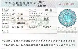 Mainland Chinese visitors to Macau are required to hold a Two-way Permit. The duration of stay is the one indicated on the exit endorsement, but if the duration indicated is longer than 90 days, the person must report to PSPF for a "special authorization of stay" within the first 90 days of entry.[7] For those who are travelling to a third country or region, they can alternatively use their Chinese passports, Chinese Travel Documents or Travel Permits to and from Taiwan for Mainland Residents for a maximum stay of 7 days.[7]