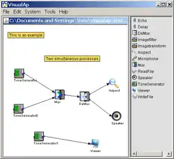 The programming language used in VisualAp to describe a system is a dataflow programming language. Execution is determined by the structure of the graphical block diagram on which the programmer connects different components by drawing connectors. These connectors propagate variables and any component can execute as soon as all its input data become available. Internally the VisualAp programming language is based on XML.