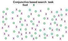 Conjunction search (also known as inefficient or serial search)[6] is a visual search process that focuses on identifying a previously requested target surrounded by distractors possessing no distinct features from the target itself.[10] An example of a conjunction search task is having a person identify a red X (target) amongst distractors composed of black Xs (same shape) and red Os (same color).[10] Unlike feature search, conjunction search involves distractors (or groups of distractors) that may differ from each other but exhibit at least one common feature with the target.[10] The efficiency of conjunction search in regards to reaction time(RT) and accuracy is dependent on the distractor-ratio[10] and the number of distractors present.[7] As the distractors represent the differing individual features of the target more equally amongst themselves(distractor-ratio effect), reaction time(RT) increases and accuracy decreases.[10] As the number of distractors present increases, the reaction time(RT) increases and the accuracy decreases.[6] However, with practice the original reaction time(RT) restraints of conjunction search tend to show improvement.[11] In the early stages of processing, conjunction search utilizes bottom-up processes to identify pre-specified features amongst the stimuli.[7] These processes are then overtaken by a more serial process of consciously evaluating the indicated features of the stimuli[7] in order to properly allocate one's focal spatial attention towards the stimulus that most accurately represents the target.[12]
