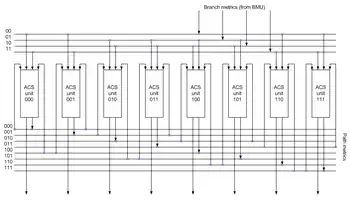 The core elements of a PMU are ACS (Add-Compare-Select) units. The way in which they are connected between themselves is defined by a specific code's trellis diagram.