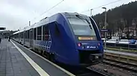 At the end of February 2012, the Regentalbahn was selected by the Zweckverband Schienenpersonennahverkehr Rheinland-Pfalz Süd (ZSPNV Süd) as the winner of the Dieselnetz Südwest - Los 2 tender. Since the 2014/2015 regular timetable change on 14 December 2014, the company has been operating the Mainz-Alzey-Kirchheimbolanden, Frankfurt-Mainz-Bad Kreuznach-Idar-Oberstein-Saarbrücken (Regional-Express services), Mainz-Bad Kreuznach-Kaiserslautern (a Regional-Express train pair during peak working hours) and Mainz-Idar-Oberstein-Baumholder/Neubrücke (Nahe) lines for 22.5 years until June 2037. In December 2016, an additional Regional-Express line was introduced on the Kaiserslautern-Bad Kreuznach-Bingen-Koblenz route, which means that 6.4 million train-kilometres per year now have to be covered.[2] The diesel network southwest contains non-electrified main and secondary railways in Rhineland-Palatinate and connects the Rhenish Hesse, Nahe, Western Palatinate and Saarland regions in particular with the Rhine-Main region and the centres of Mainz, Rüsselsheim am Main and Frankfurt am Main as well as Frankfurt Airport.