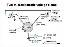 The voltage clamp is an experimental method used by electrophysiologists to measure the ion currents through the membranes of excitable cells, such as neurons, while holding the membrane voltage at a set level.[1] A basic voltage clamp will iteratively measure the membrane potential, and then change the membrane potential (voltage) to a desired value by adding the necessary current. This "clamps" the cell membrane at a desired constant voltage, allowing the voltage clamp to record what currents are delivered. Because the currents applied to the cell must be equal to (and opposite in charge to) the current going across the cell membrane at the set voltage, the recorded currents indicate how the cell reacts to changes in membrane potential.[2] Cell membranes of excitable cells contain many different kinds of ion channels, some of which are voltage-gated. The voltage clamp allows the membrane voltage to be manipulated independently of the ionic currents, allowing the current–voltage relationships of membrane channels to be studied.[3]