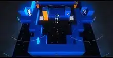Volume's gameplay has been designed by Bithell similar to the stealth elements of the Metal Gear Solid series.[6] The game is presented in a top-down third-person view of the Volume simulation, showing a floor layout, Robert's avatar, and several guards and other antagonists that patrol the area. Several different variety of guards exist, each of which have different patterns of movement and how they respond to seeing the player character; such guards include archers that have a long range of vision, rogues that can see in a full circle around them, dogs that work by sense of smell and track the player by proximity, and automated turrets that react much faster than other guards.[7] When spotted, the player has a short amount of time to attempt to break the line of sight and take cover, otherwise the simulation will restart, either fully or at the most recent checkpoint that the player has crossed. Guards behave in established patterns, and the player can disrupt these by making noise, such as flushing a toilet, or purposely cross their line of sight to draw them away from a patrol route. The player is unable to kill these foes, but over the course of the story, gain an arsenal of tools to distract them and avoid detection; once the player has one or more such tools, they can create a loadout for their character to select which gadgets they wish to take into a level.