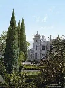 Vorontsov's building activities started a tradition of imperial residency of the area which would attract many of Russia's elite to also build villas and palaces in the Crimea. One of the first such buildings was the Gaspra Palace, designed by William Hunt in the 1830s for Prince Alexander Golitsyn, one of Alexander I's most trusted advisors. Blore's design inspired another straightforward imitation on the eastern shore of the Black Sea: the Dadiani Palace in Zugdidi that was commissioned by the last Princess of Mingrelia in 1873 and, at the time of the Russian Revolution, was in possession of the House of Murat.[39] Neo-Moorish architectural elements were also incorporated in the design of the royal villas in Dulber and Likani.