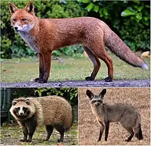 | Clockwise from top: red fox, bat-eared fox, tanuki | |