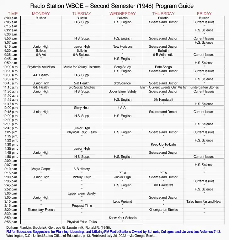 | Radio Station WBOE — Second Semester (1948) Program Guide[50] |