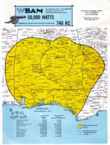 This station first began licensed operations in 1953 as a daytime-only 50,000-watt AM station broadcasting on 740 kHz as WBAM.[8] Owned and operated by the Deep South Broadcasting Company, WBAM broadcast area covered most of Alabama and parts of Georgia and Florida. "The Big BAM" aired a variety of music formats over the years, including Top 40 during the late-1960s and early-1970s, but by 1973 had settled on a country music format.[9] As a daytimer, WBAM had to cease broadcasting each night at sunset and the station played "Dixie" as a sign-off.