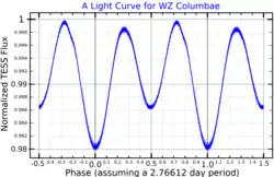 WZ Columbae was originally listed as a slowly pulsating B-type star by the General Catalogue of Variable Stars. However, observations from Hempel & Howlger (2003) reveal it to be overabundant in strontium and barium.[14] Combined with Hipparcos photometry, this led to the object being reclassified as an Alpha2 Canum Venaticorum variable.[8] Based on data collected in the Hipparcos passband, it fluctuates between magnitudes 5.27 and 5.29 over 1.38 days.[7][20] However, TESS data suggests a period of 2.76618±0.00004 days; double that of the earlier data.[16]