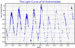 W Andromedae is a variable star in the constellation of Andromeda. It is classified as a Mira variable and S-type star,[8] and varies from an apparent visual magnitude of 14.6 at minimum brightness to a magnitude of 6.7 at maximum brightness, with a period of approximately 397.3 days.[3] The star is losing mass due to stellar winds at a rate of 2.79×10−7 M☉/yr.[5]