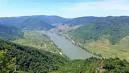 listen)) is an Austrian valley with a picturesque landscape formed by the Danube river. It is one of the most prominent tourist destinations of Lower Austria, located midway between the towns of Melk and Krems that also attracts "connoisseurs and epicureans" for its high-quality wines.[1] It is 36 kilometres (22 mi) in length[2] and was already settled in prehistoric times. A well-known place and tourist attraction is Dürnstein, where King Richard I of England was held captive by Leopold V, Duke of Austria. The architectural elegance of its ancient monasteries (Melk Abbey and Göttweig Abbey), castles and ruins combined with the urban architecture of its towns and villages, and the cultivation of vines as an important agricultural produce are the dominant features of the valley.[3][4][5]