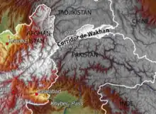 The Wakhan Corridor (Pashto: واخان دهلېز, romanized: wāxān dahléz, Persian: دالان واخان, romanized: dâlân vâxân) is a narrow strip of territory in Badakhshan Province of Afghanistan, extending to Xinjiang in China and separating the Gorno-Badakhshan Autonomous Region of Tajikistan in the north from the northern areas of India in the south.[1][2][3][4][5] From this high mountain valley the Panj and Pamir rivers emerge and form the bigger Amu River. A trade route through the valley has been used by travellers going to and from East, South and Central Asia since antiquity.[6]