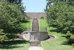 Three large reservoirs are filled daily by the Florence Water Works and distributed to the central part of the city by gravity. Three booster pumps the water to higher parts of the area, including Dundee. Walnut Hill is part of the original Omaha Water Works built in 1882. It was designed by Homer Virgil Knouse.[1] They were originally fed from an intake at Burt Street and the Missouri River.[2] The original landscaping at Walnut Hill, including sidewalks, streets, trees, and flowers cost $10,000.[3]