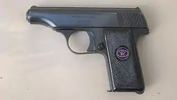 The Model 8 was approximately 130mm in length, and weighed 12.5 ounces.[2] The slide fully covered the barrel, and the trigger guard served as a take-down (disassembly) lever, securing the recoil spring, with no barrel bushing. In order to disassemble, the hinged trigger guard had to be pulled down, then the slide was pulled back and up. On the left side of the slide was stamped Walther's Patent Mod. 8. over the Walther banner. Stamped on the right side of the slide was Waffenfabrik Walther Zella-Mehlis (Thür.) These inscriptions were found on all variants. There are 16 triangular, angled grooves on each side of the slide. Cross-hatched hard rubber grips held enameled medallions: on the left side, the "CW" (Carl Walther) monogram, and on the right "6.35", with the serial number on the right side grip tang. Proof marks indicating the place and date of manufacture appear above the trigger in some variants. The Model 8 was produced with a standard blued finish, and was also made with nickel plate or gold plate, ivory or wood grips, and engraving on those intended as gifts. A rare variant was manufactured with an aluminum alloy frame[1]: 49 and was considerably lighter at 280 grams (9 ounces).[3]